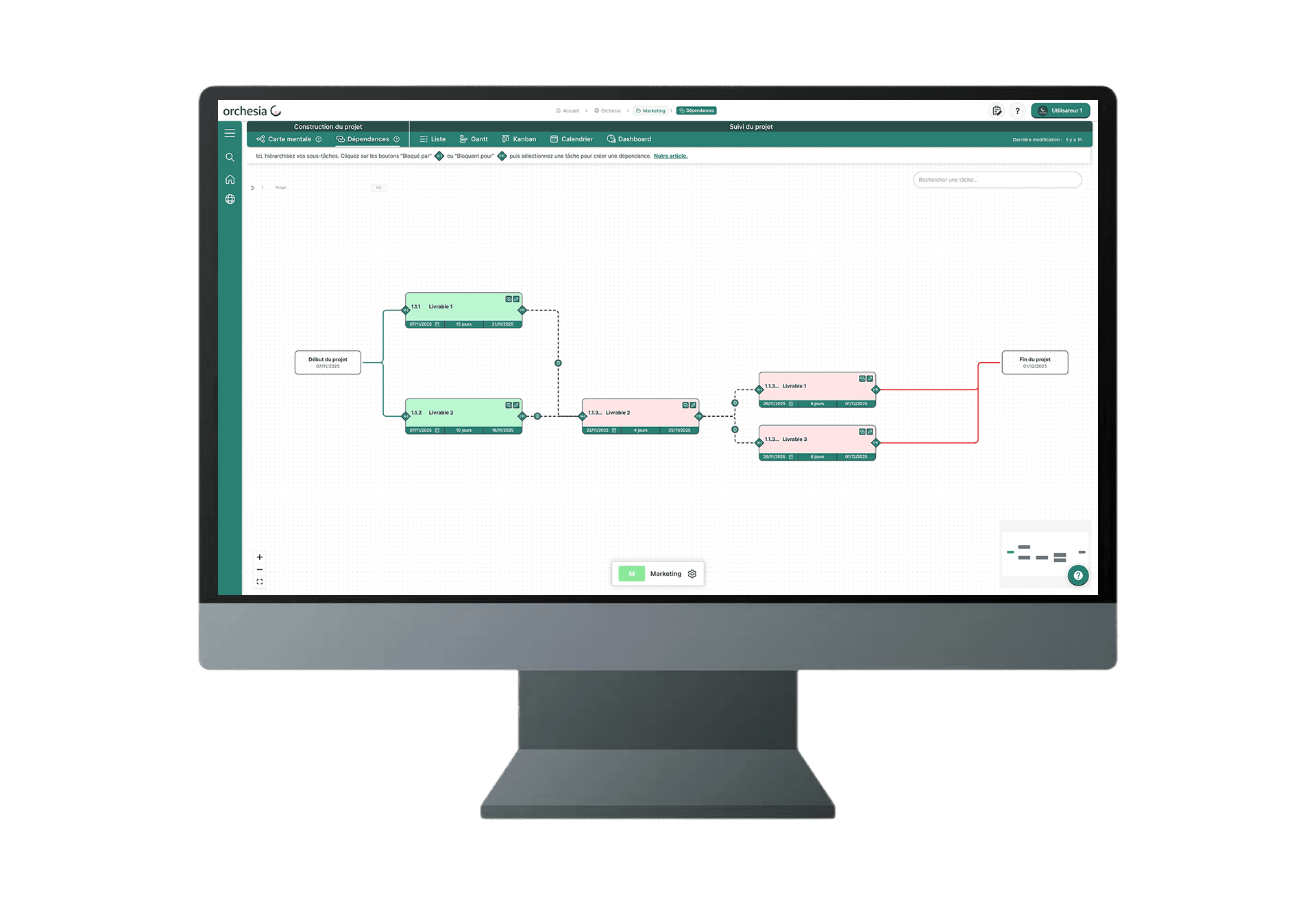 Dans Orchesia, les dépendances sont définies en quelques clics, à partir d'une structure projet claire et lisible par tous. Cette approche facilite la co-construction du PERT et permet d'impliquer facilement les équipes métiers dans l'identification des contraintes réelles.